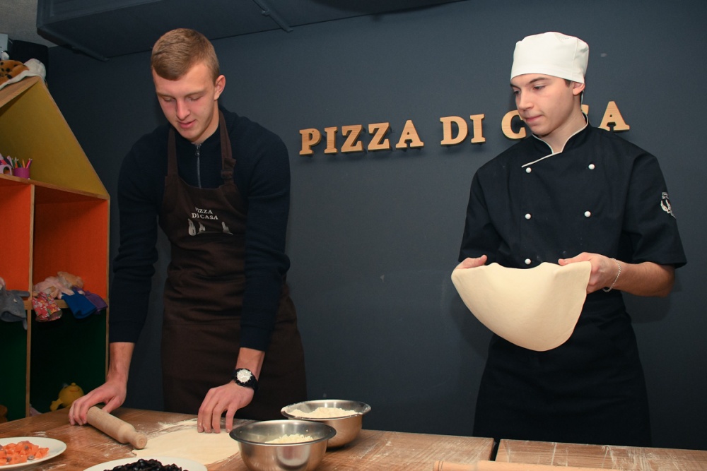 Кожен готував свою піцу, вибираючи соус та інгредієнти за власним бажанням. Спершу розкатали тісто, по 200 грамів кожне. Володимир Маханьков і Вадим Таран обрали томатний соус, а Сергій Мороз - вершково-базиліковий. «У дитинстві я більше м'ясо любив, але в останні роки полюбив рибу», - поділився Володимир. Проте для піци все ж обрав м'ясні інгредієнти: бекон, салямі та прошито. «Рибу я люблю в чистому вигляді, без тіста», - пояснив свій вибір голкіпер.