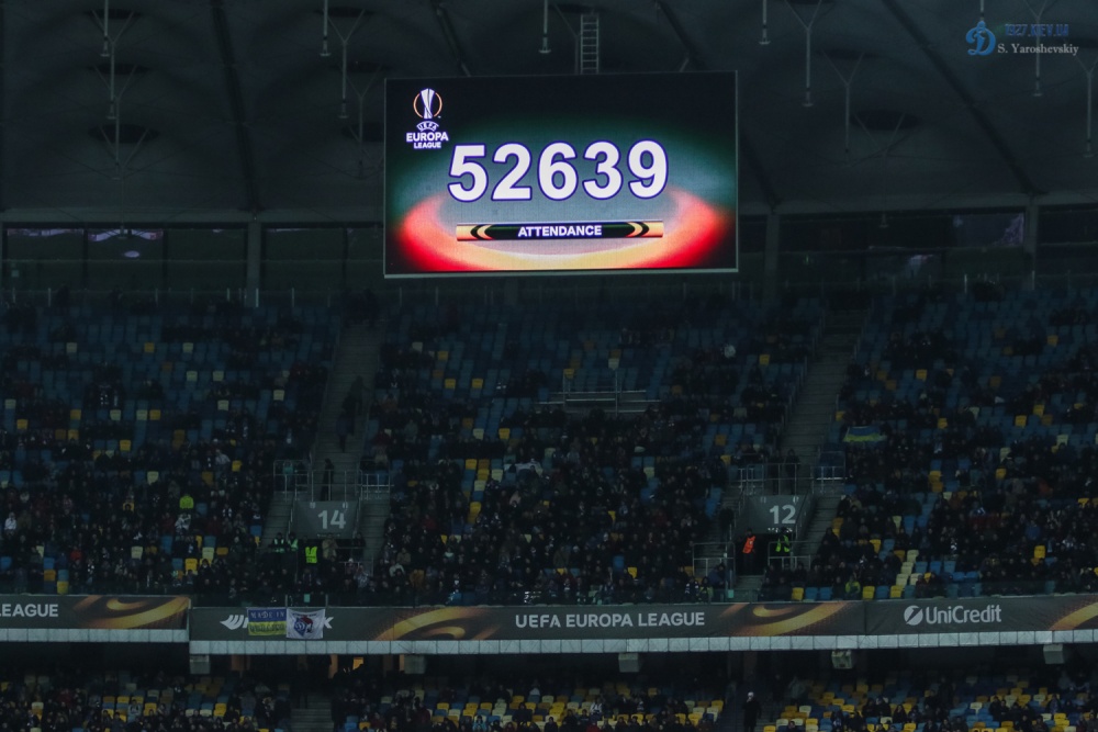 Підтримати «біло-синіх» у бажанні пробитися до чвертьфіналу престижного європейського турніру прийшли на трибуни НСК «Олімпійський» 52 639 уболівальників. Подібна відвідуваність головної арени країни стала найбільшою за останні два роки – 24 лютого 2016 року матч 1/8 фіналу Ліги чемпіонів із англійським «Манчестер Сіті» зібрав глядацьку аудиторію у 53 691 глядача.