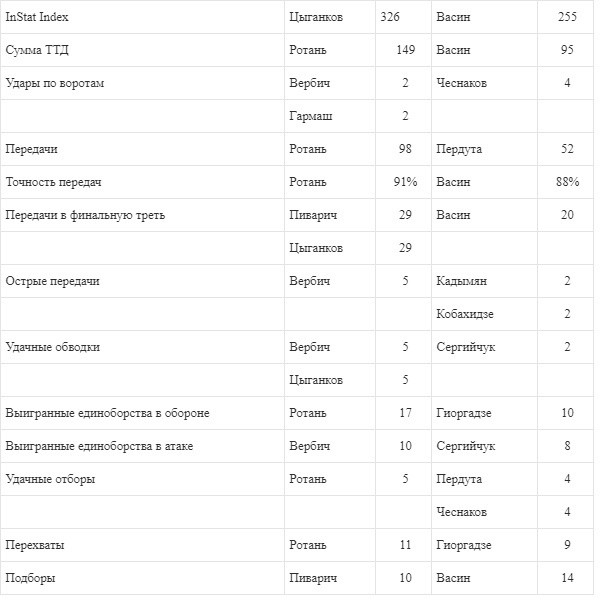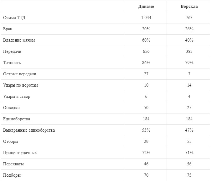Показники ігрової діяльності в матчі Динамо - Ворскла.
