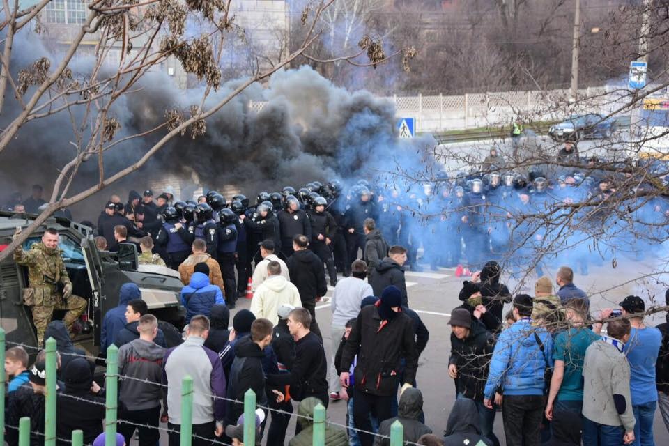 Інцидент відбувся в середині другого тайму біля стадіону. Фанати на трибунах запалили димові шашки та застосували петарди. З метою убезпечити інших вболівальників поліцейські вивели порушників за межі стадіону. Однак товариші стали на їхній захист, вибігли зі стадіону та почали жбурляти у бік правоохоронців та службовий автотранспорт каміння, що в цей час несли службу із забезпечення публічної безпеки.