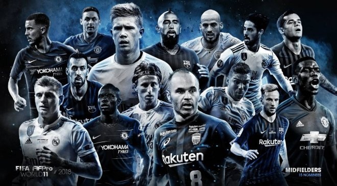 Серхіо Бускетс (Барселона), Каземіро (Реал), Філіппе Коутінью (Барселона), Кевін де Брюйне (Манчестер Сіті), Еден Азар (Челсі), Іньєста (Барселона/Віссел Кобе) , Іско (Реал), Н'Голо Канте (Челсі), Тоні Кроос (Реал), Неманья Матіч (Манчестер Юнайтед), Лука Модрич (Реал), Поль Погба (МЮ), Іван Ракітич (Барселона), Давід Сілва (Ман Сіті), Артуро Відаль (Баварія/Барселона).