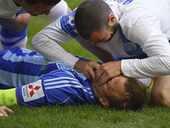 Подальше зіткнення призвело до важких наслідків для нашого півзахисника, який потім терміново зі стадіону швидкою допомогою був відправлений в місцеву лікарню.