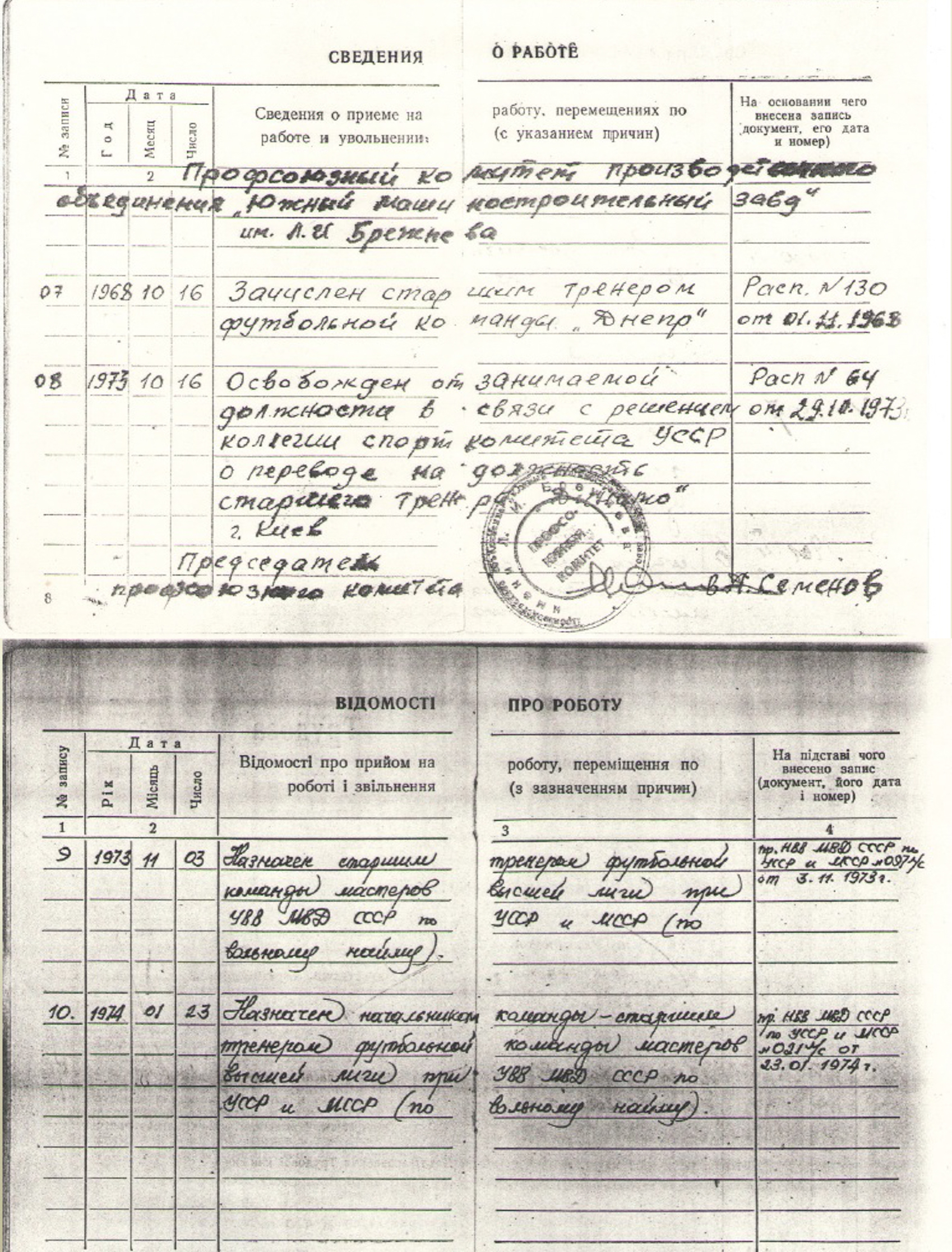 Саме цього дня — 16 жовтня (акурат півстоліття тому) — Валерій Васильович Лобановський розпочав тренерську кар’єру. Цьому є документальне підтвердження — запис у його трудовій (див. фото).
